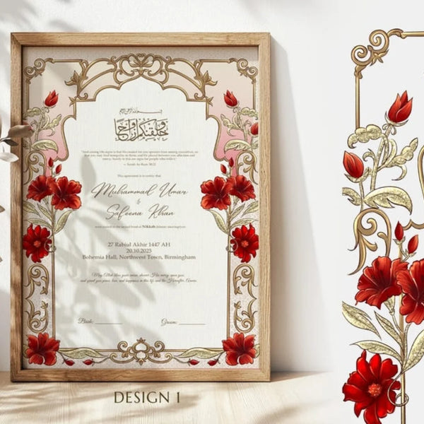 Sacred Islamic marriage certificates with traditional calligraphy and floral motifs